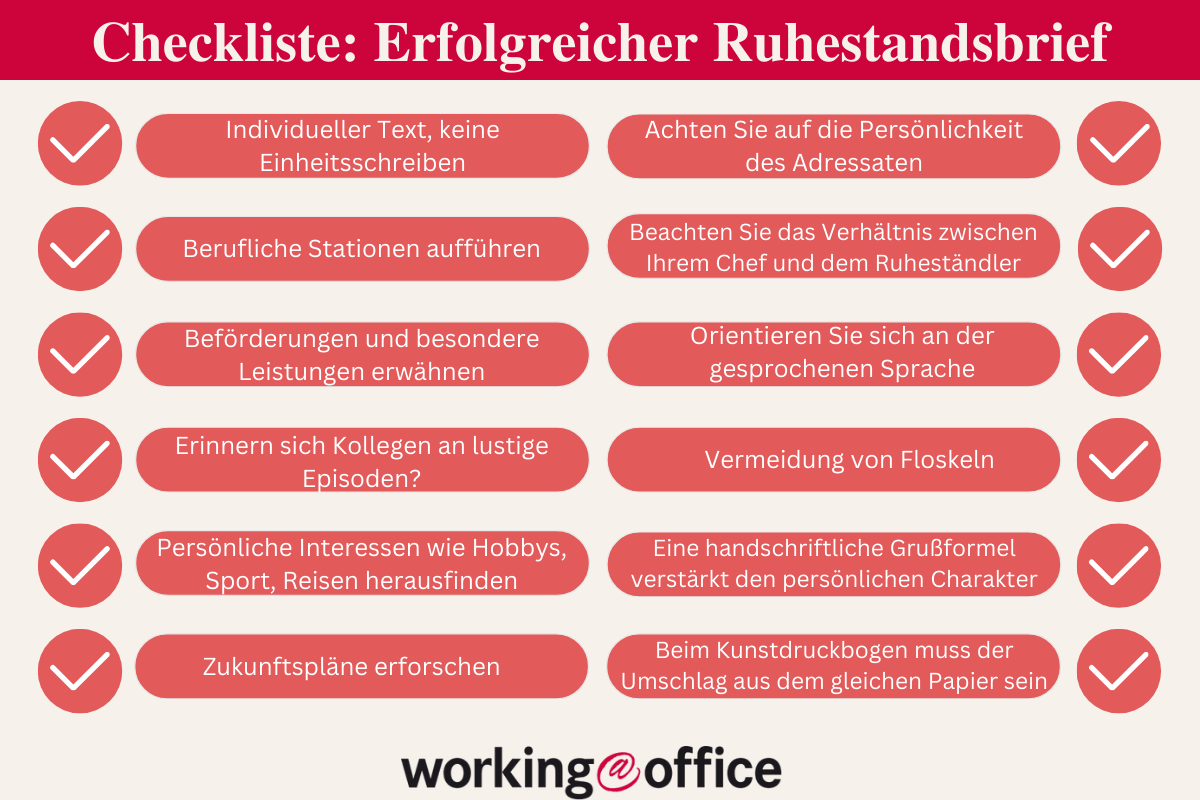 Wichtig ist, einen seriösen Eindruck zu hinterlassen. Die Verabschiedung in den Ruhestand ist ein würdevoller Anlass und sollte demnach auch so respektiert werden. Lustige Anekdoten können die Rede auflockern und zu einem Lächeln des Gegenübers beitragen.