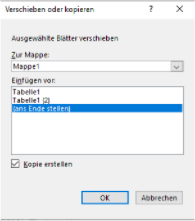 - Für das Kopieren des Arbeitsblattes setzen Sie das Häkchen bei „Kopie erstellen“ und geben Sie an, ob das kopierte Arbeitsblatt vor einem anderen Arbeitsblatt oder ans Ende gestellt werden soll. Drücken Sie zum Abschluss OK. Das Arbeitsblatt wird nach Ihren Vorgaben verschoben oder kopiert.
