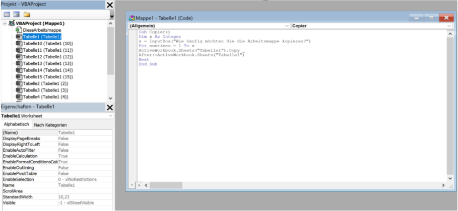 - Klicken Sie im Visual-Basic-Auswahlfenster ebenfalls links die Arbeitsmappe an, die Sie mehrfach kopieren möchten. Im Beispiel ist dies die Tabelle 1.