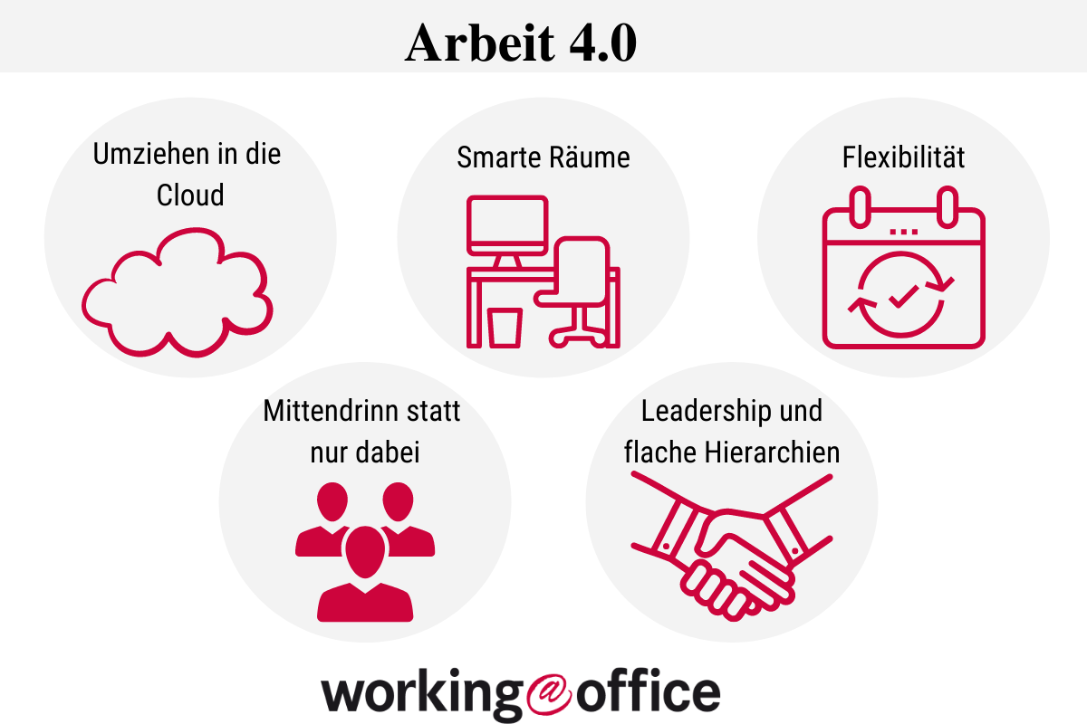 Software zieht in die Cloud um, aber wie sieht es mit dem Menschen aus, die im Büro arbeiten? Die Corona-Pandemie hat gezeigt: Arbeit funktioniert auch, wenn nicht immer alle vor Ort im Office sind. Remote Work kommt im Kontext von Arbeit 4.0 eine immer wichtiger werdende Rolle zu – aber dazu später mehr. New Work zeigt sich jedoch auch im Büro, und zwar ganz konkret an den Räumlichkeiten.