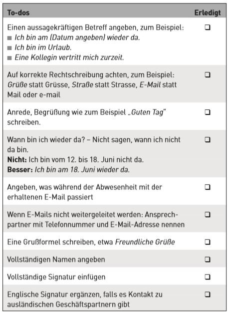 Mit einer solchen Information zeigen Sie nicht nur Verlässlichkeit, sondern reduzieren auch die Zahl der E-Mails, die Sie während Ihres Urlaubs erhalten.