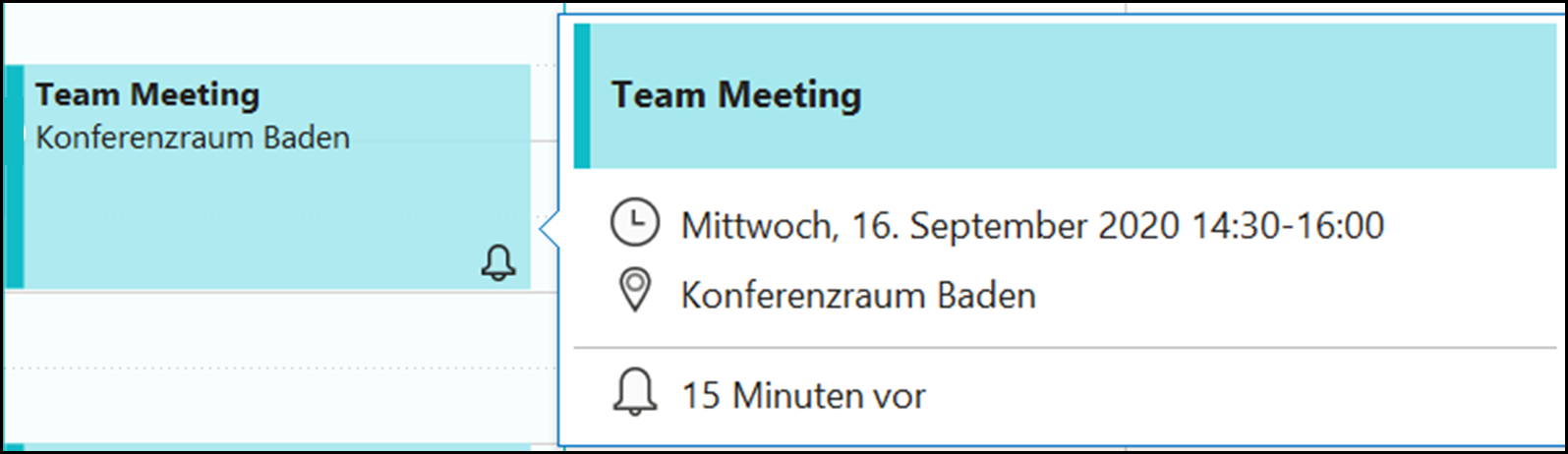 Zeigen Sie auf einen Termin, erscheinen nach einem Moment direkt daneben in einem kleinen Extrafenster einige Details. Dort gibt es jetzt kleine Symbole, um die Infos klarer darzustellen. Das ist bei der Zeit, dem Ort oder dem Besprechungsorganisator der Fall. Störende Pop-ups, womöglich noch mit Sound, werden so nicht gebraucht.Zeigen Sie auf einen Termin, erscheinen nach einem Moment direkt daneben in einem kleinen Extrafenster einige Details. Dort gibt es jetzt kleine Symbole, um die Infos klarer darzustellen. Das ist bei der Zeit, dem Ort oder dem Besprechungsorganisator der Fall. Störende Pop-ups, womöglich noch mit Sound, werden so nicht gebraucht.