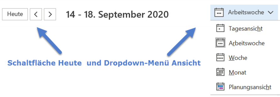 In der gegenüberliegenden Ecke rechts oben gibt es ebenfalls eine Änderung. Hier wurde ein kleines Dropdown-Menü implementiert. Dahinter sitzt ein nach unten weisender Pfeil. Klicken Sie darauf, wechseln Sie bequem und schnell die Ansicht, zum Beispiel von der Tagesansicht zur Monatsdarstellung oder in die bereits erwähnte Planungsansicht.