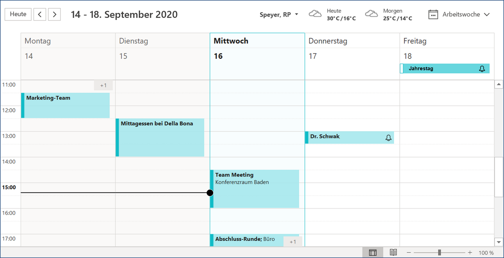 Besonders gelungen sind zwei kleine Änderungen in der Titelleiste des Kalenders. Die ist immer zu sehen, egal, welche Ansichtsart eingestellt ist. Bisher war es so, dass Sie das Tagesdatum mit zwei Pfeilen davor fanden, über die Sie vor- und zurück navigierten. Anschließend kam rechts der Ort und eventuell die Aussicht auf das Wetter. Nun gibt es links vor den Pfeilen eine neue Schaltfläche: Heute. Damit springen Sie direkt zum aktuellen Datum, egal an welcher Stelle im Kalender Sie sich gerade befinden. Der umständliche Wechsel zur Registerkarte Start samt Klick in die Gruppe Gehe Zu und den Befehl Heute ist damit überflüssig.