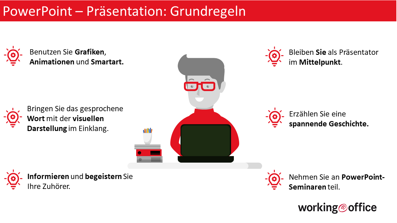 In diesem Beitrag zeigen wir von Team working@office, wie Sie PowerPoint im Arbeitsalltag sinnvoll nutzen. Angefangen bei der Entwicklung überzeugender Folienlayouts über den gezielten Einsatz von Animationen bis hin zur Arbeit mit Masterfolien, Vorlagen und Live-Präsentationen. Auch häufige Fehler bei Schriftwahl, Diagrammplatzierung oder Textmenge nehmen wir unter die Lupe und liefern Ihnen praxisnahe Impulse für Präsentationen, die nicht nur informieren, sondern im Gedächtnis bleiben.