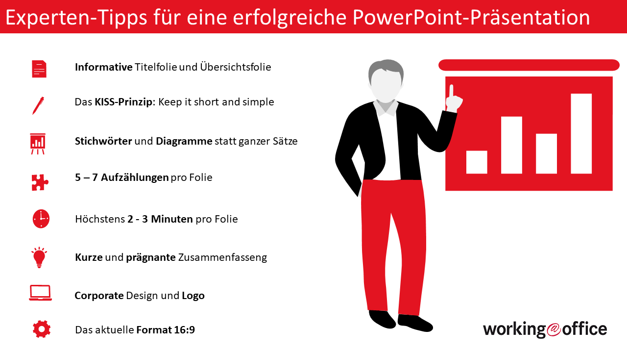 In Bezug auf die Konzeption und Gestaltung einer Präsentation können unzählige in der Praxis erprobte Hilfestellungen erwähnt werden. Die folgenden 7 Tipps sind vor allem für Sekretärinnen interessant, die zum ersten Mal mit Microsoft Office arbeiten. Wer bisher wenig Erfahrung mit der Erstellung von Bildschirmpräsentation hat, profitiert von den folgenden Tipps:
