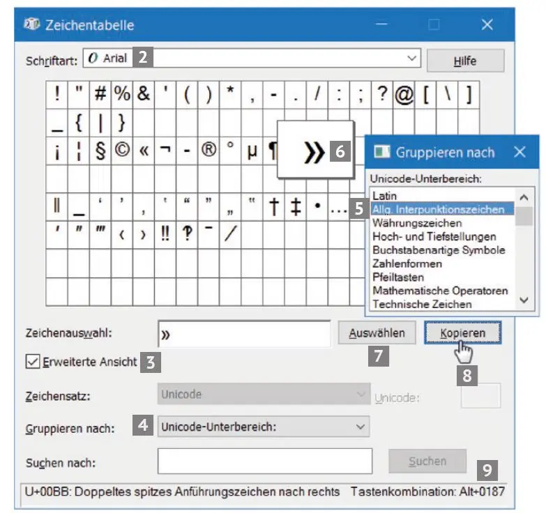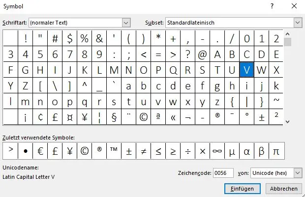In der Zeichentabelle finden Sie rechts unten eine Ziffernfolge. Mit der können Sie ganz einfach über die Tastatur Ihr gewünschtes Sonderzeichen einsetzen. Einfach über die gedrückt gehaltene Alt-Taste und die Ziffernfolgen eingeben.
