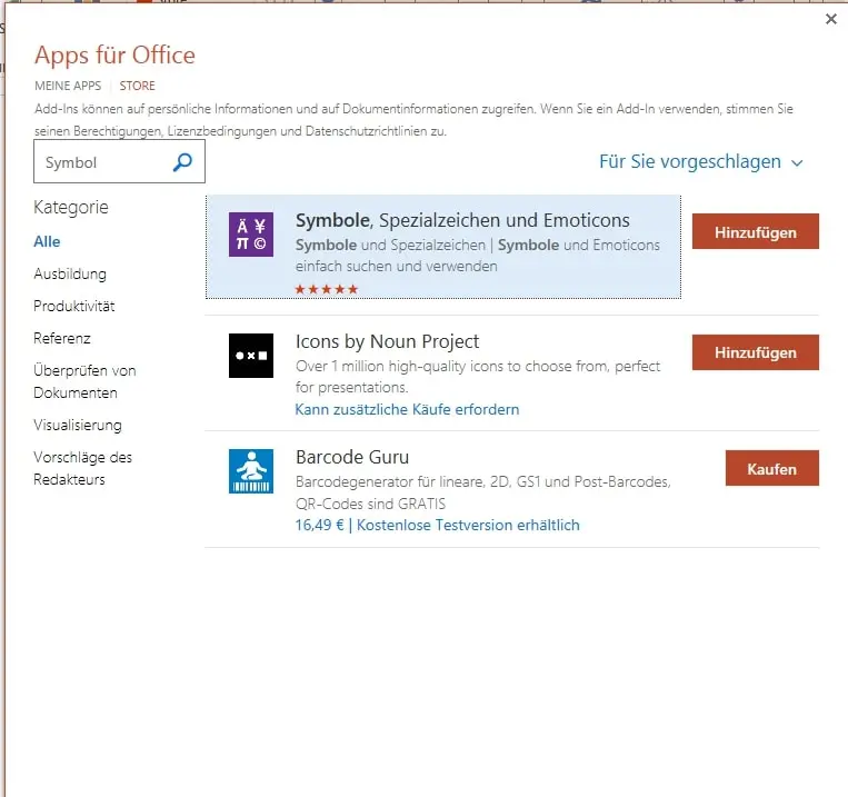 - Gehen Sie zunächst auf den Reiter Einfügen und dann auf Store. Hier geben Sie in das Suchfeld den Begriff „Symbol“ ein und drücken die Return-Taste. Nun werden Ihnen unter anderem die App Symbole, Spezialzeichen und Emoticons angezeigt.