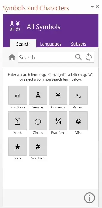- Über das Feld Search können Sie gezielt nach den Zeichen suchen – allerdings müssen Sie hierbei den englischen Begriff verwenden.
