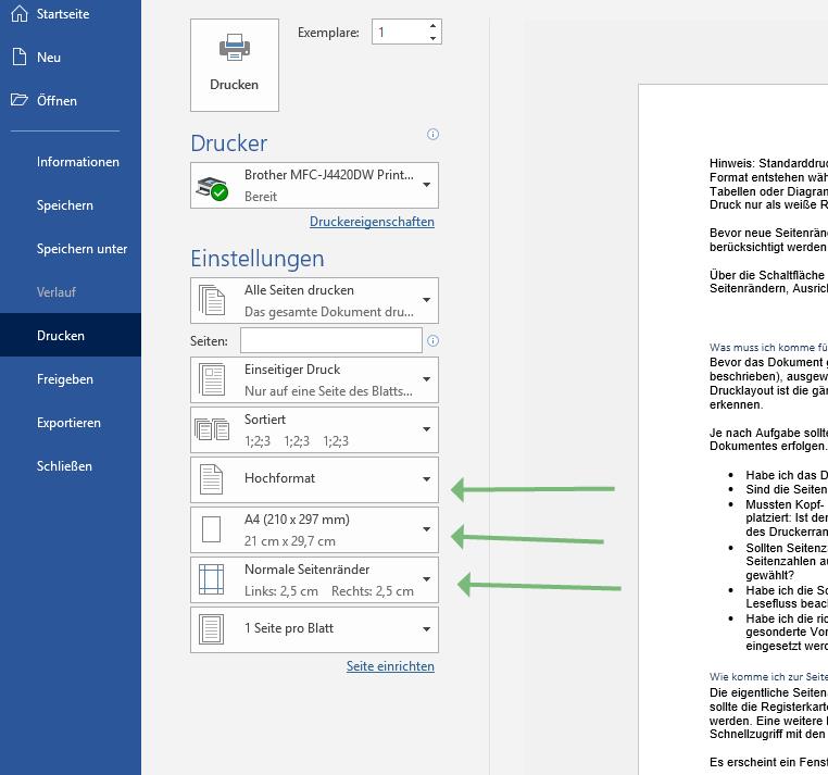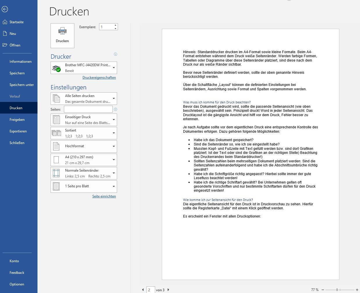 Nach dem Erstellen eines Dokumentes sollten vor dem Druck alle Einstellungen (wie oben beschrieben) kontrolliert werden. In den Druckoptionen lassen sich detailliert Einstellungen für einen optimalen Druck vornehmen. Üblicherweise passt sich die Seitenansicht in den Druckoptionen dementsprechend an. In der Regel kann man das Dokument nun einfach ausdrucken.