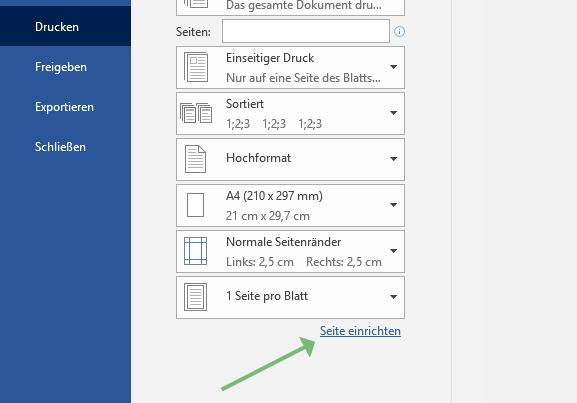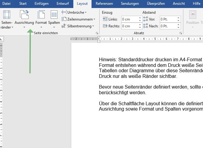 Zur Einrichtung eines Dokumentes gehören gesonderte Einstellungen. Microsoft setzt mit Word auf ein standardisiertes Verfahren. Sobald ein neues Dokument geöffnet wird, sind bereits Seitenränder sowie das Format (A4) vorgegeben. Da Dokumente in unterschiedlichen Formaten mit einem Standarddrucker ausgedruckt werden können, sind die Seitenränder mit 2,5 cm pro Seite vorgegeben. Hier wird explizit der Druckerrand berücksichtigt.