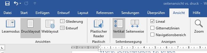 Bevor das Dokument gedruckt wird, sollte die passende Seitenansicht (wie oben beschrieben), ausgewählt sein. Prinzipiell druckt Word in jeder Seitenansicht. Das Drucklayout ist die gängigste Ansicht und hilft vor dem Druck, Fehler besser zu erkennen.
