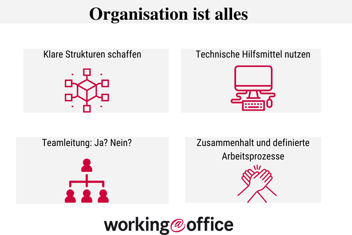 Aber auch als Assistentin oder Office Professional ist die Organisation im Team oft vorteilhaft. Denn das Stichwort lautet hier: Synergien. Die Vorgehensweise im Team eignet sich dabei besonders für klassische Sekretariatsaufgaben. Einzelne Arbeitsprozesse, wie Korrespondenz oder Büroablage, lassen sich zusammengefasst in Blöcken meist schneller und einfacher erledigen.