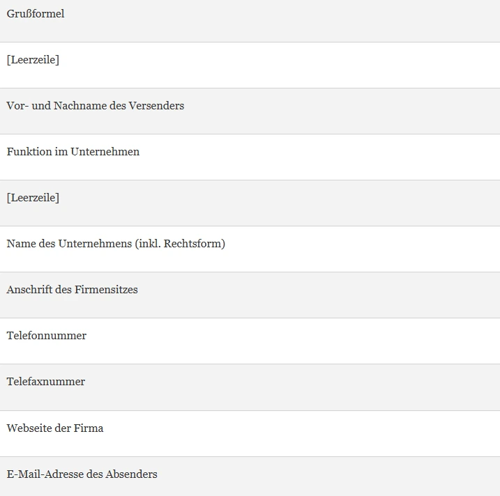 Bei geschäftlichen E-Mails außerdem: HBR-Nummer, zuständiges Registergericht, Rechtsform und Sitz des Unternehmens, Name des Geschäftsführers oder Aufsichtsratsvorsitzenden