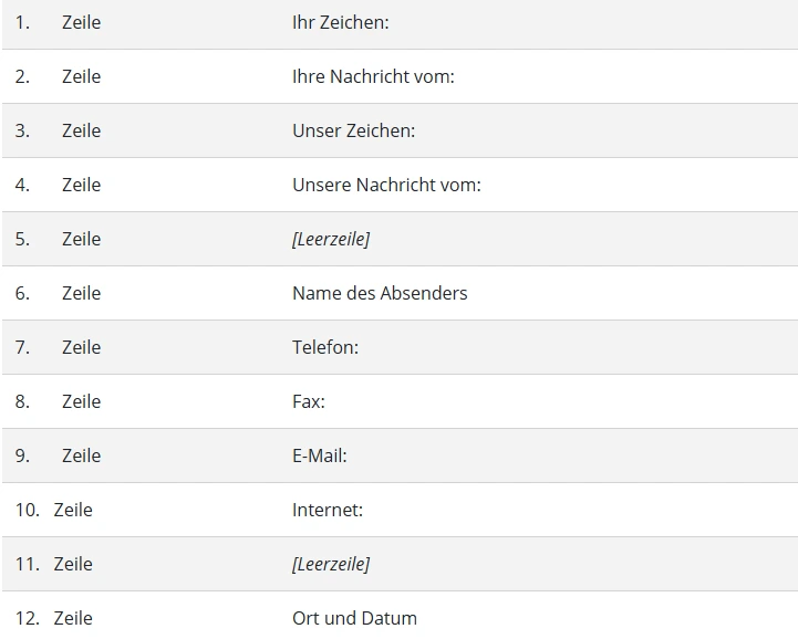 Vergessen werden sollten auch nicht der Name des Unternehmens oder der Behörde sowie die Überschrift. Zu achten ist außerdem auf Vollständigkeit und Verständlichkeit. Der Leittext steht dabei in der Regel über dem Schreibtext oder links davon. Die Länge der jeweiligen Felder richtet sich dabei nach dem längsten aller Wörter in der Tabelle. Auf Abkürzungen soll laut DIN 5008 dabei verzichtet werden.