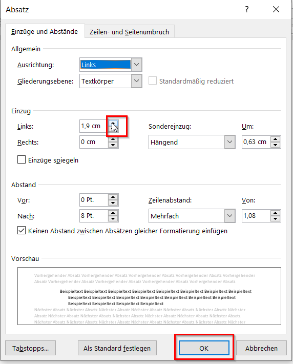 - Durch einen Klick auf „Ok“ legen Sie die Änderung für das gesamte Dokument fest und können auch hier die Standards der DIN 5008 umsetzen.