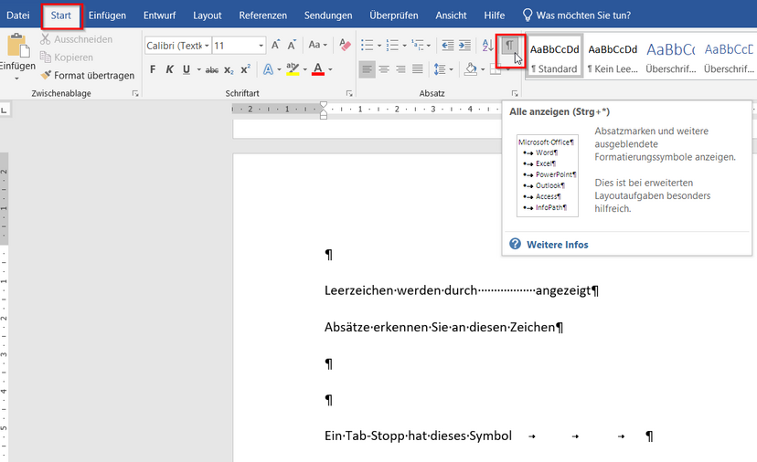 - Durch einen weiteren Klick auf dasselbe Symbol blenden Sie die Absatzmarken wieder aus