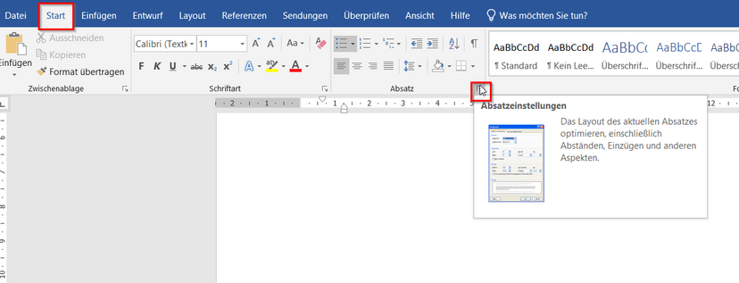 - Wählen Sie im Menüband den Reiter „Start“ und klicken Sie auf „Absatzeinstellungen“