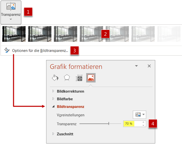 - Falls keine der Voreinstellungen für das Bild passt, unten auf Optionen für die Bildtransparenz klicken [3]. Es öffnet sich der Aufgabenbereich Grafik formatieren. Dort lässt sich bei Bildtransparenz mittels Schieberegler den Transparenzwert für das Bild individuell anpassen [4].