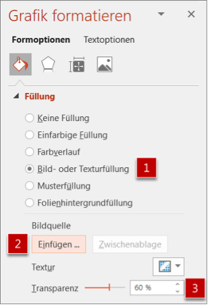 - Rechts im Aufgabenbereich Form formatieren unter Füllung die Option Bild- oder Textfüllung aktivieren[1]. Der Name des Aufgabenbereichs ändert sich nun in Grafik formatieren.