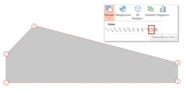 - Nach dem letzten Eckpunkt [5] schließt man die Form, indem man auf den ersten Punkt zeigt und den Vorgang des Zeichnens per Doppelklick beendet.