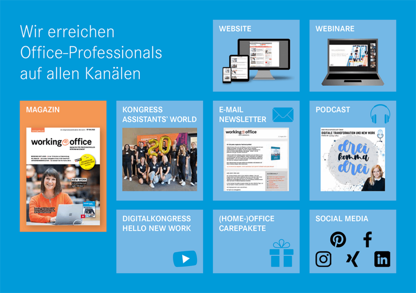 working@office ist seit mehr als 65 Jahren das führende Medium für die heimlichen Entscheider*innen im Büro: Assistenzkräfte, Sekretär*innen & Office-Professionals. Wir bieten unseren Kund*innen die aktuellsten Informationen und konkrete Unterstützungen in all ihren facettenreichen Aufgaben – und das sind eine ganze Menge! Unsere Kund*innen kaufen Ihre Produkte, sie bestellen Ihre Dienstleistungen und bereiten Kaufentscheidungen für das Management vor.