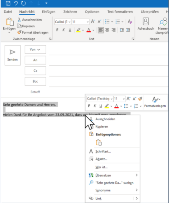 Alternativ haben Sie die Möglichkeit, im ersten Schritt den Text in der Standardschriftart Calibri zu schreiben. Nach der inhaltlichen Konzeption der Nachricht markieren Sie den Text und klicken mit der rechten Maustaste in die Markierung. Sie können die Schriftart für den markierten Text wie oben beschrieben anpassen. Dies funktioniert sowohl über das oberhalb eingeblendete Fenster „Schriftart“ und ebenso über den Menüpunkt „Schriftart“ im Drop-Down-Menü.