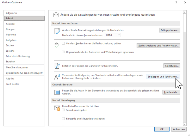- Im Outlook-Optionsmenü rufen Sie den Menübereich-„E-Mail“ auf. Klicken Sie dort im nächsten Schritt die Schaltfläche „Briefpapier und Schriftarten“ an.