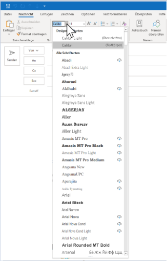 - Klicken Sie mit Ihrer Maus in den Textbereich der neuen E-Mail. Standardmäßig wird die Registerkarte „Nachricht“ geöffnet. In dieser können Sie im Menübereich „Text“ die Schriftarten anpassen. Klicken Sie einmal auf den Button-Down-Pfeil neben den Schriftarten, um das Auswahlmenü zu öffnen und wählen Sie die für Ihre E-Mail passende Schriftart aus.