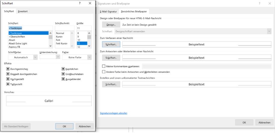 - Es erscheint ein neues Fenster „Signaturen und Briefpapier.“ Hier können Sie die Schriftarten und zusätzlich die Schriftgröße und die Farbe nach Ihren Wünschen abändern. Möglich ist hier das Adaptieren der Schriftarten für: