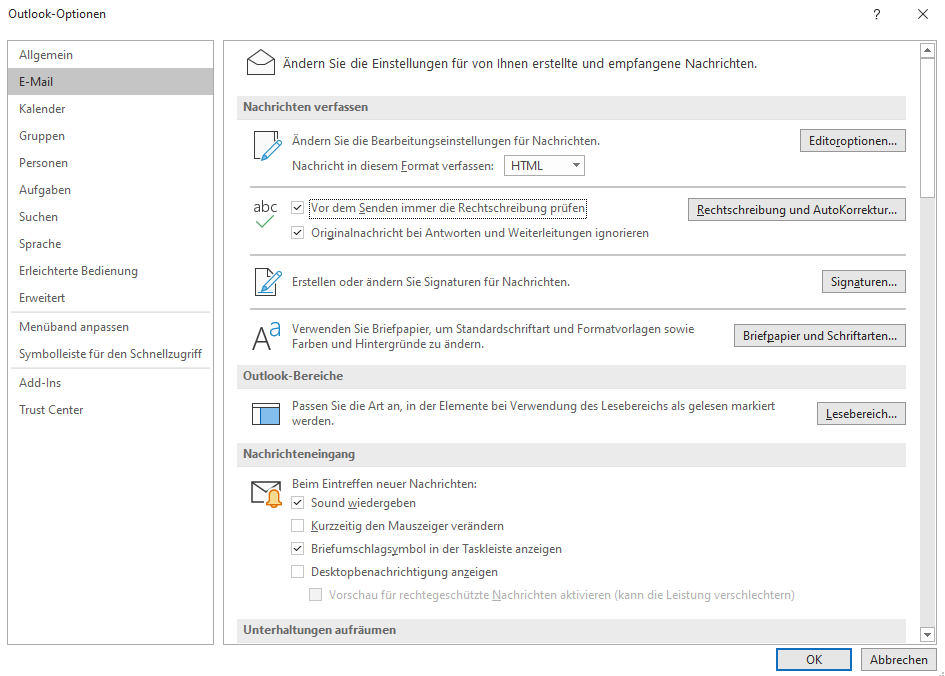 3) Es öffnet sich nun ein neues Fenster. Wählen Sie links die Kategorie „E-Mail“ aus und aktivieren Sie die Option „Vor dem Versenden immer die Rechtschreibung prüfen.“