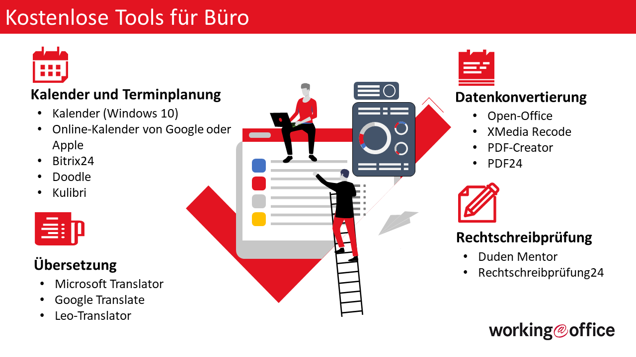 Der technologische Fortschritt hat darüber hinaus noch unzählige weitere und sehr praktische kleinere Hilfen für den Büroalltag hervorgebracht. Diese meist kostenlosen, internetbasierten Applikationen oder Softwareprogramme bieten jenseits der bekannten Anwendungen oft schnelle Hilfen und unterstützen die Bürokraft bei allen möglichen Aufgaben im Office.