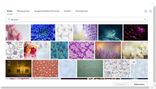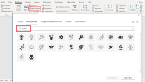 Interessant und zielführend ist der Menüpunkt Piktogramme, den sie auf der rechten Seite der Registerkarte im Menübereich Piktogramme finden. Neben der allgemeinen Suchfunktion können Sie über die thematischen Sortierung ebenfalls ein passendes Symbol für jeden Anlass finden. Mit dem Keyword „Blume“ werden Ihnen zum Beispiel eine Vielzahl von Blumen angezeigt, die Sie mit einem Mausklick markieren und in Ihr Dokument einfügen können.