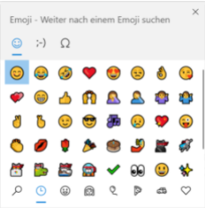 - Nutzen Sie zum Einfügen von Smileys oder Emojis die folgende Tastenkombination: W-Taste + Punkt-Taste. (W+.) Es erscheint eine umfangreiche Auswahl von Emojis und Smileys, die Sie mit einem Klick in Ihr Dokument einfügen können.