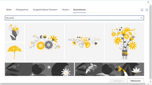 Einzigartig wirken ebenso die Illustrationen. Geben Sie im Suchfeld Blumen ein, finden Sie wunderschön gestaltete Illustrationen, die mit wenigen Klicks in einen Briefbogen eingefügt oder in eine Einladungskarte eingearbeitet werden können.