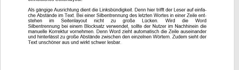 Als gängige Ausrichtung dient die Linksbündigkeit. Denn hier trifft der Leser auf einfache Abstände im Text. Bei einer Silbentrennung des letzten Wortes in einer Zeile entstehen im Seitenlayout nicht zu große Lücken. Wird die Silbentrennung in Word bei einem Blocksatz verwendet, sollte der Nutzer im Nachhinein die manuelle Korrektur vornehmen. Denn Word zieht automatisch die Zeile auseinander und hinterlässt zu große Abstände zwischen den einzelnen Wörtern. Zudem sieht der Text unschöner aus und wirkt schwer lesbar.